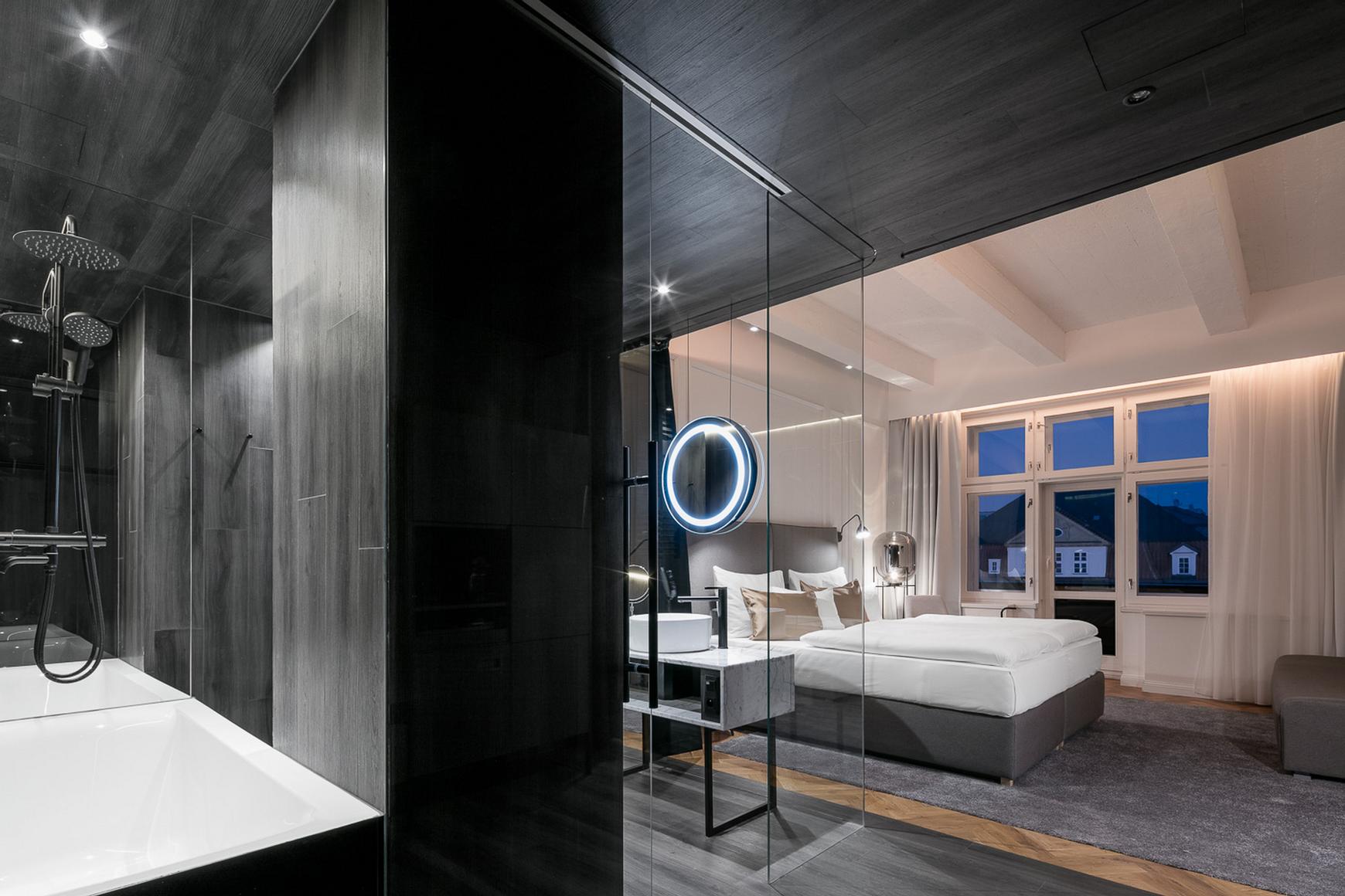 . חדר אמבטיה עם אמבטיה עם מערכת בועות או מקלחון